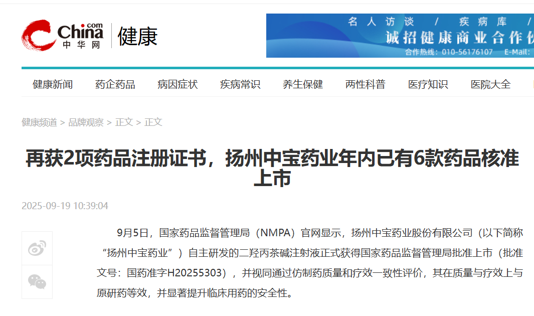 再獲2項藥品注冊證書,揚州中寶藥業年內已有6款藥品核準上市